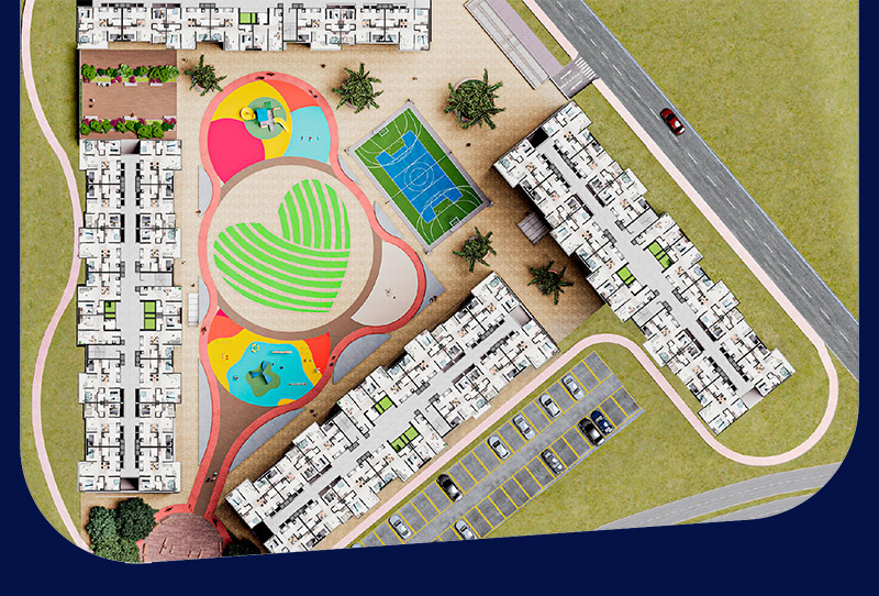 El proyecto cuenta con una innovadora plaza central de acceso peatonal de 4.300 m2, formada por la intersección de las torres y que brindan una zona de esparcimiento con amplios senderos peatonales para caminatas, confortables áreas de descanso, una BiblioTech de 358 m2, zonas verdes y un parque con zona de juegos infantiles, este espacio además contará con 1.800 m2 de comercio, distribuidos en 31 locales comerciales desde 40 hasta 57 m2 que brindaran beneficios, productos y servicios a los residentes, aportando al desarrollo del tejido social y económico del sector, todo esto en el primer piso de tu propia vivienda.